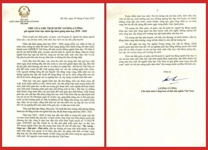 Nhân dịp khai giảng năm học 2025 – 2026, Chủ tịch nước Lương Cường đã gửi Thư chúc mừng tới ngành Giáo dục, các thầy cô giáo, cán bộ quản lý, nhân viên và học sinh, sinh viên cả nước.